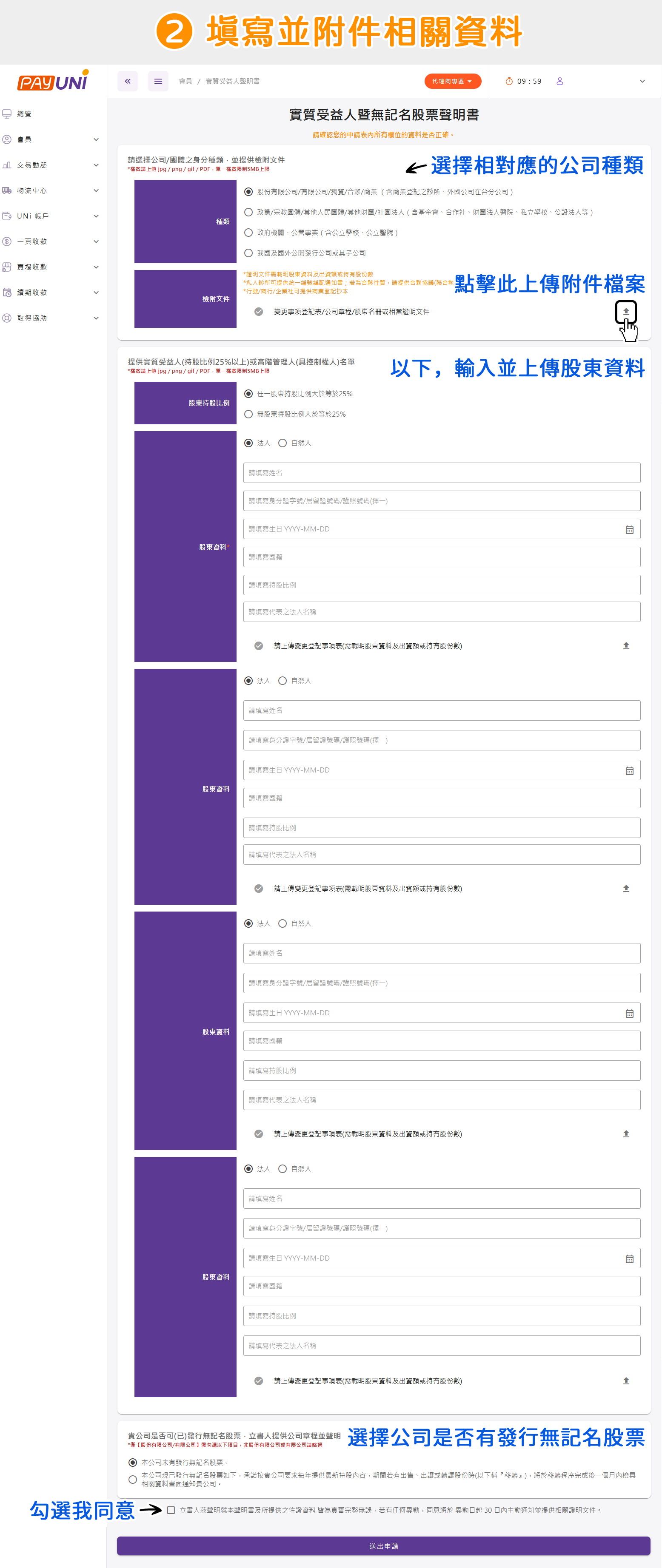 「PAYUNi 統一金流」為遵循《洗錢防制法》及《第三方支付服務業防制洗錢及打擊資恐辦法》之規定,需辨識法人或團體會員之實質受益人,須請申辦使用 PAYUNi 之「會員性質」為「商業會員」之商家,再額外提供「實質受益人調查資料」(個人會員不用填寫)。