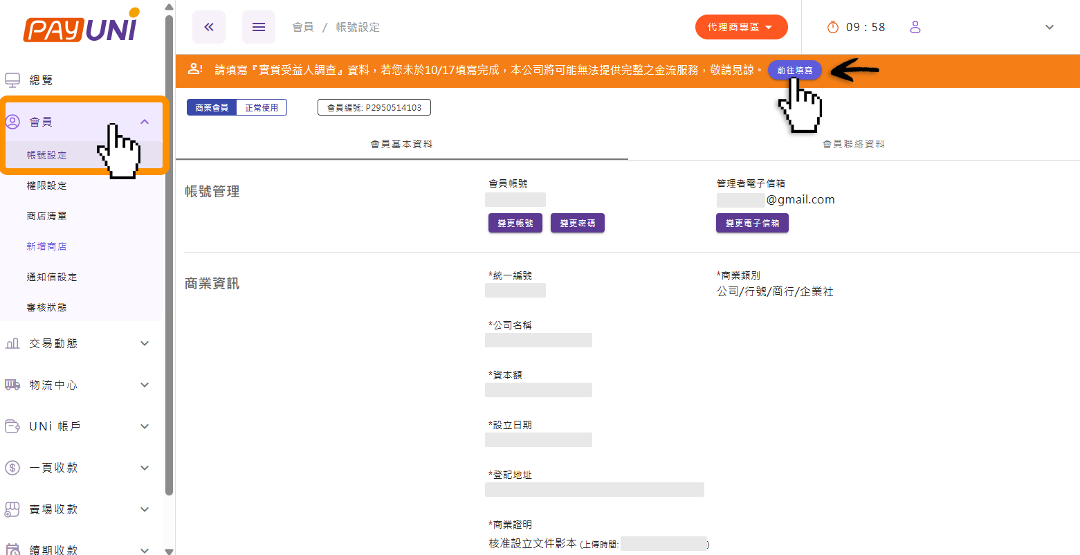 ※ 如果不小心將彈出視窗關閉,可以於左方選單點擊前往「會員」→「帳號設定」→即可在頁面上方處觀看到「請填寫『實質受益人調查』資料」之公告,點擊紫色按鈕「前往填寫」即可(如圖 )。