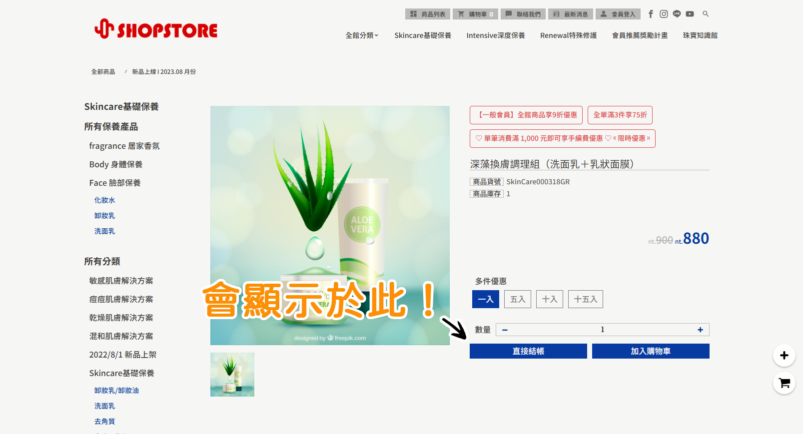說明:啟用「直接結帳按鈕」後,「直接結帳」按鈕會顯示於各商品的「商品內頁」,顧客點擊後,系統即會自動將商品加入購物車,並導向至「結帳頁面」。