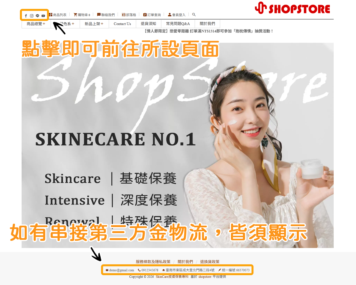 那在「Email」、「電話」、「地址」、「統一編號」皆會顯示於頁面底部。(如店家有需要使用第三方金物流(例如:綠界),前三項皆需一定要顯示,以避免綠界審核失敗)