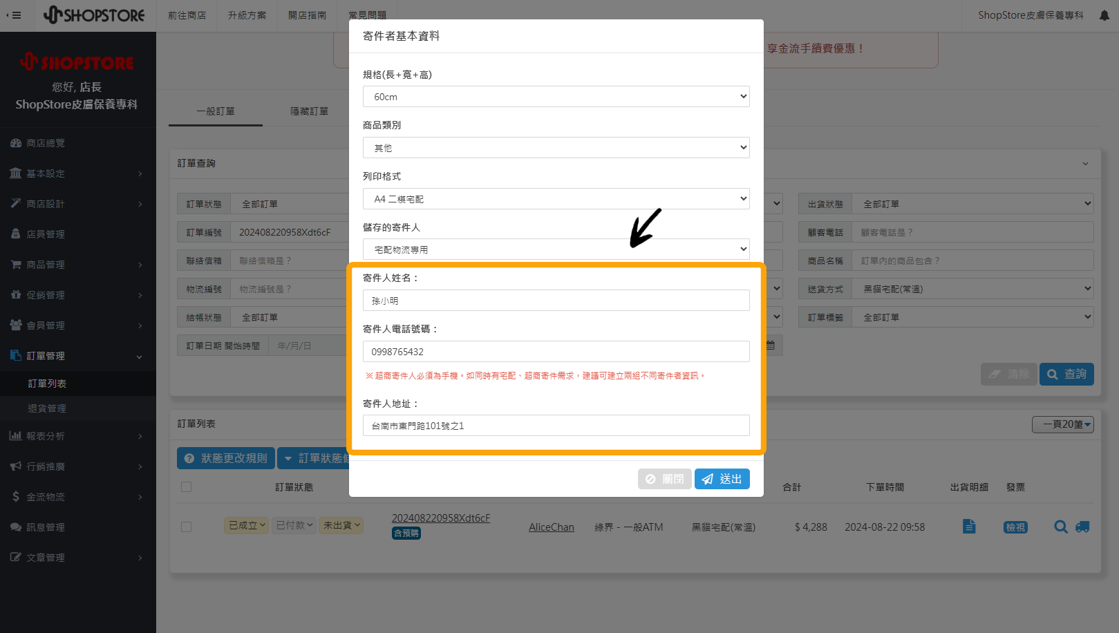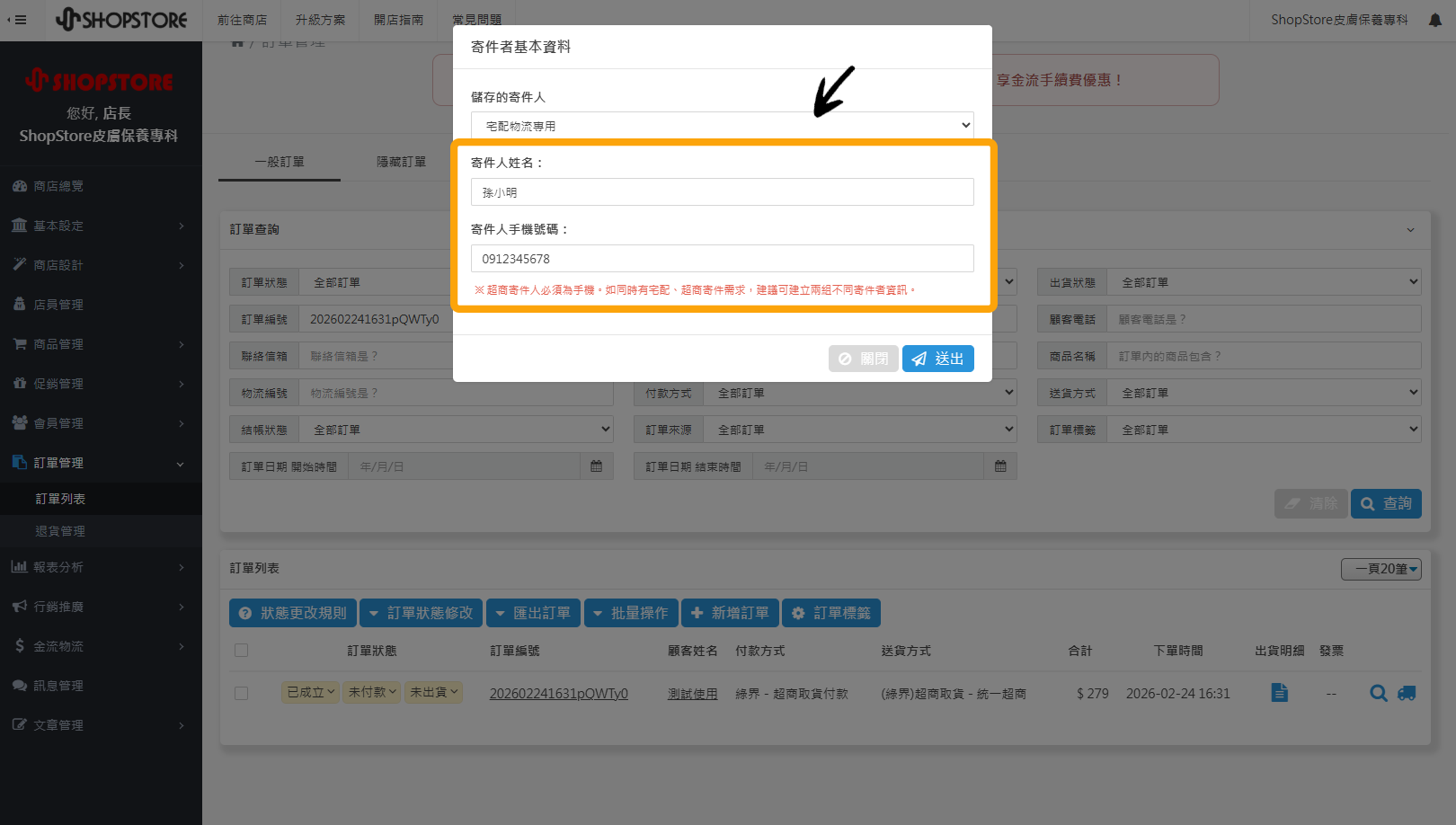 剛所設定的「物流寄件人姓名」與「連絡電話」,也會自動帶入,店家在後台「訂單管理」的「超商取貨物流」點擊右方藍色「物流車」後所產生的「寄件者基本資料」視窗內,以產生物流單。