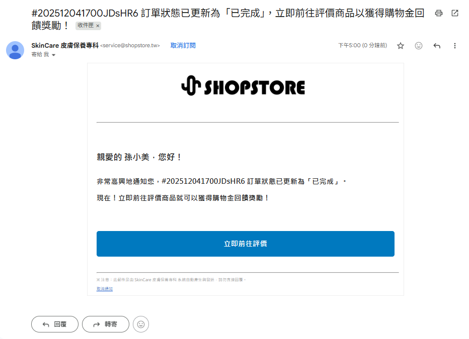 - 當訂單狀態已確實更新為「已完成」,系統即會自動發送「評論商品已獲得購物金回饋」的 Email 信件予顧客,讓顧客知道該筆訂單已可進行評論(如圖)。
